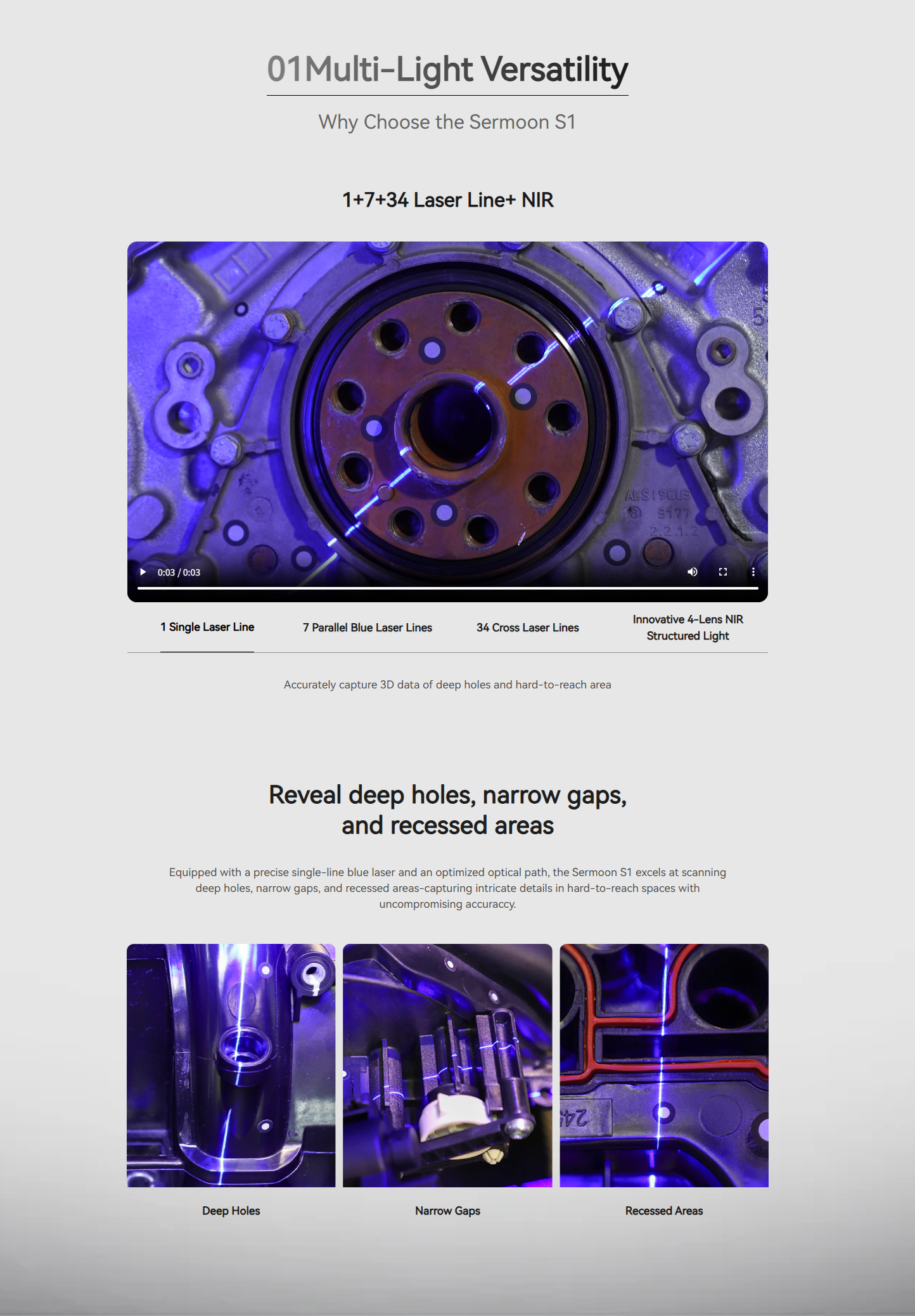 The Creality Sermoon S1 is a metrology-grade, multi-light 3D scanner designed for professionals who demand speed without sacrificing precision. Featuring a unique triple-light system, it combines 34 cross blue lasers, 7 parallel blue lasers, and a dedicated single laser line to capture deep holes, narrow gaps, and recessed areas that other scanners miss.